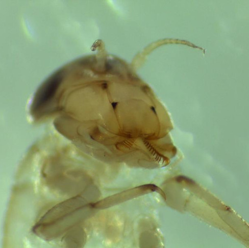 Optioservus riffle beetles (Family: Elmidae) are aquatic beetles that are can be found crawling along the bottom and surfaces of fast-moving streams. Both the larvae [Fig 8. Optioservus larvae] and adults [Fig 9. Optioservus adult] are fully aquatic, equipped with strong claws and oxygen-collecting hydrofuge hairs for living in swift currents